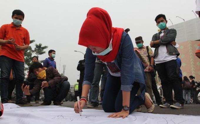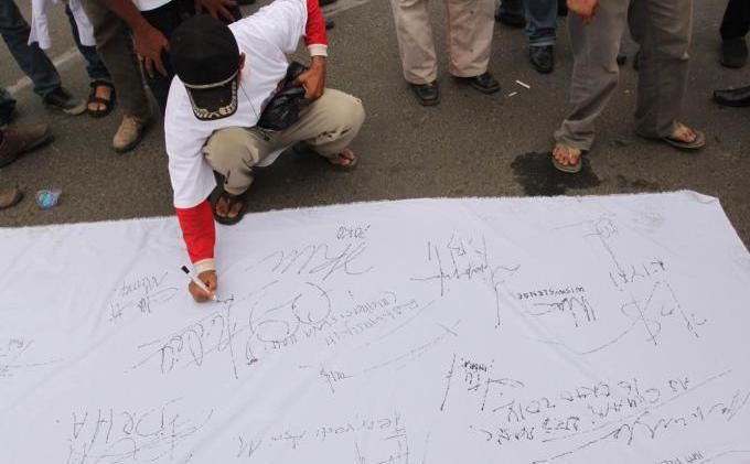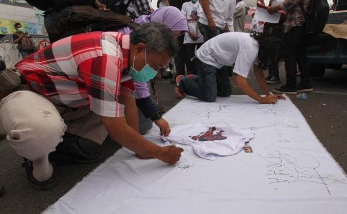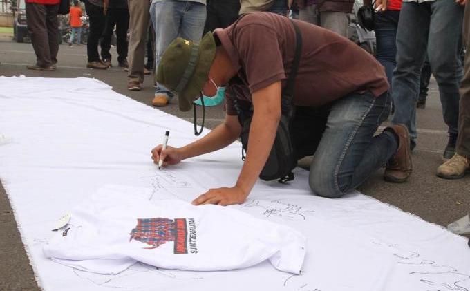 Aksi pengumpulan tanda tangan yang diadakan oleh Laskar Rakyat Jokowi (LRJ) Sumsel di Bundaran Air Mancur Palembang, Kamis (16/10/2014).