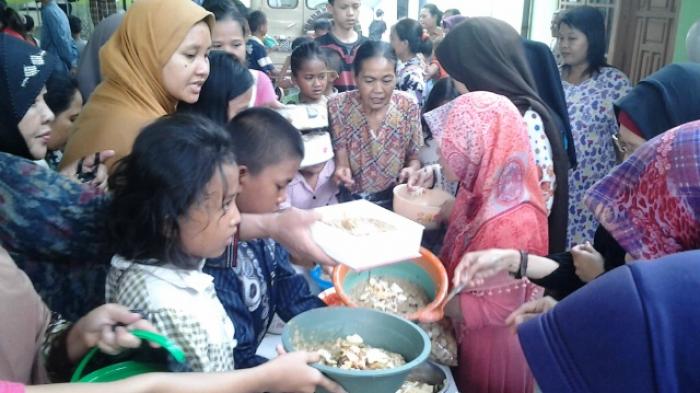 TRIBUNSUMSEL.COM, PALEMBANG - Pembagian bubur di Jalan KH Azhari Kelurahan 12 Ulu Kecamatan Seberang Ulu 1 berlangsung meriah. Banyak warga yang datang berebut, dari anak-anak hingga orang dewasa.