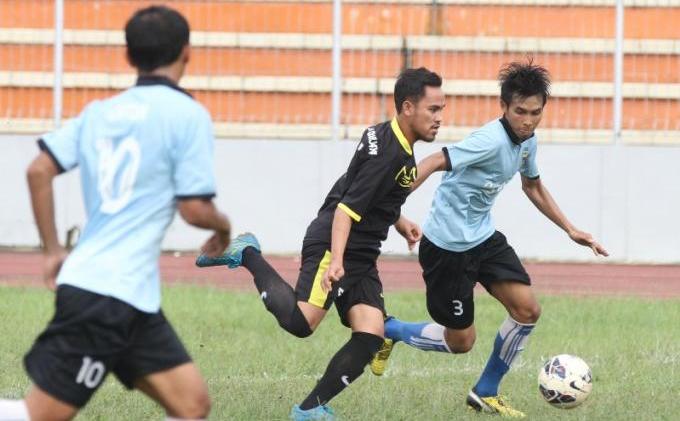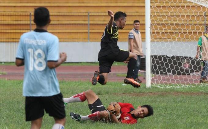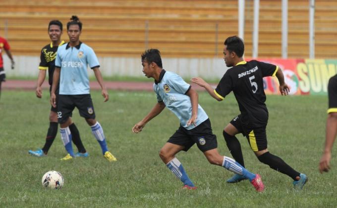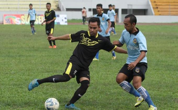 TRIBUNSUMSEL.COM, PALEMBANG - Pemain PS Pusri saat berebut bola dengan pemain Bina Sriwijaya pada laga lanjutan Sumsel Super League di Stadion Bumi Sriwijaya Palembang, Kamis (22/1/2015). Pertandingan ini dimenangkan oleh PS Pusri.