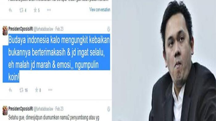 "Budaya indonesia kalo mengungkit kebaikan bukannya berterimakasih & jd ingat selalu, eh malah jd marah & emosi,, ngumpulin koin!," kicau Farhat melalui akun Twitter @farhatabbaslaw, Senin (23/5/2015).