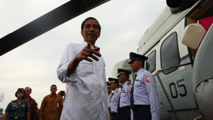 Presiden Joko Widodo (Jokowi) sebelum menaiki helikopter yang akan diterbangkan menuju Pelabuhan Kualatanjung, Kabupaten Batubara, Sumatera Utara, Selasa (27/1/2015).