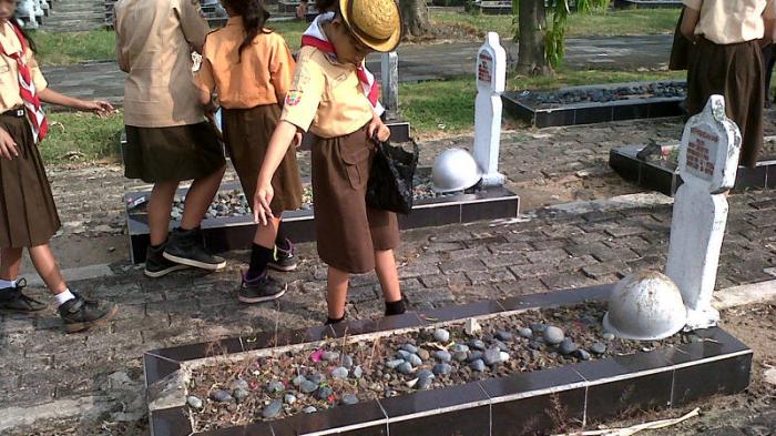 Suasana tabur bunga berjalan lancar, puluhan anak yang hadir dari beberapa pramuka penggalang baik itu SD maupun SMA terlihat antusias menaburkan bunga di atas makam satu persatu.