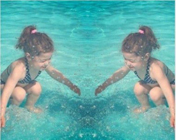 Kalau dilihat dari latar belakang, gelembung air, dan ekspresi wajah bocah perempuan itu, ia seperti berada dalam air.
