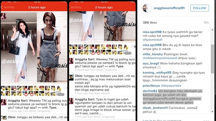 "weeeey TM yang paling suci sedunia please ya sampe lo block ig gw gtu? takut bgt apa?-with Tyas," tulis Anggita dalam akun Path-nya.