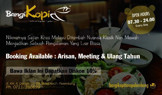 Bangi Kopitiam Palembang memberikan penawaran menarik bagi pengunjung yang akan menikmati sajian yang dihidangkan berupa potongan harga 10 persen jika