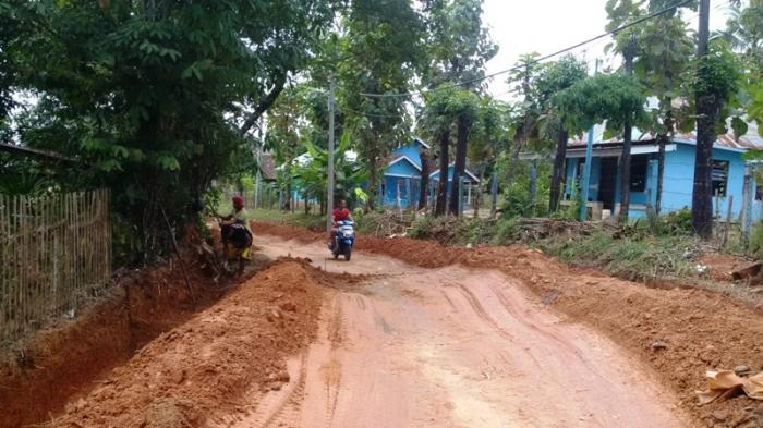 Pasalnya, di tengah bahu jalan terdapat tumpukan tanah, yang digali oleh pekerja membuat parit.