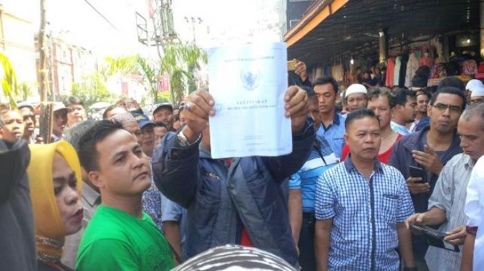 "Ini ada konspirasi oleh PD Pasar untuk mencari uang saja. Masak kami mesti disuruh menyewa dikios yang sudah kami beli, meskipun statusnya HGB," ujarnya saat dikonfirmasi.