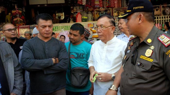 Para pemilik toko di pasar 16 Ilir sedang berdiskusi dengan Sat Pol PP