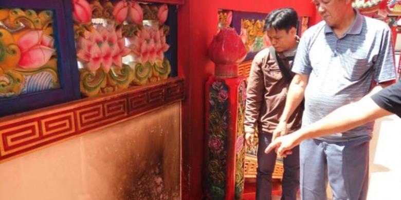 Pembina Vihara Kwan Im Kiung, Kim Liong saat menunjukan lokasi dilemparnya Bom Molotov yang terjadi, Senin (14/11) pukul 02.30 WIB.
