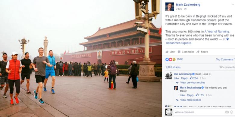 Mark Zuckerberg mengunggah foto dirinya sedang jogging di China, Jumat (18/3/2016) walau di tengah polusi udara.