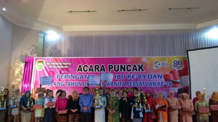 Puluhan perempuan yang tergabung dalam organisasi Dharma Wanita Persatuan (DWP) Sumatera Selatan nampak sumringah saat memegang piala