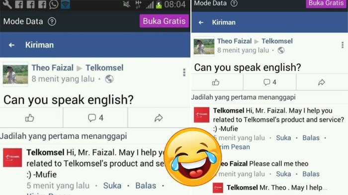 Percakapan Theo ddan Telkomsel ini disebarluaskan oleh akun Facebook Kementrian Humor Indonesia pada Senin (25/12/2017).