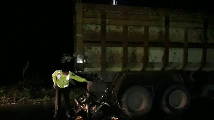 Namun diduga dump truk tersebut mendadak mengerem, diduga korban yang berjalan dengan kecepatan tinggi tidak dapat mengelak.