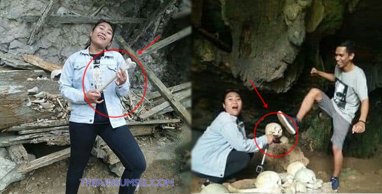 Dalam foto-foto yang tersebar di media tampak seorang wisatawan berpose menginjak tengkorak, lalu lainnya mengangkat dan memainkan salah satu tulang jenazah dan berpose seolah sedang bermain gitar.
