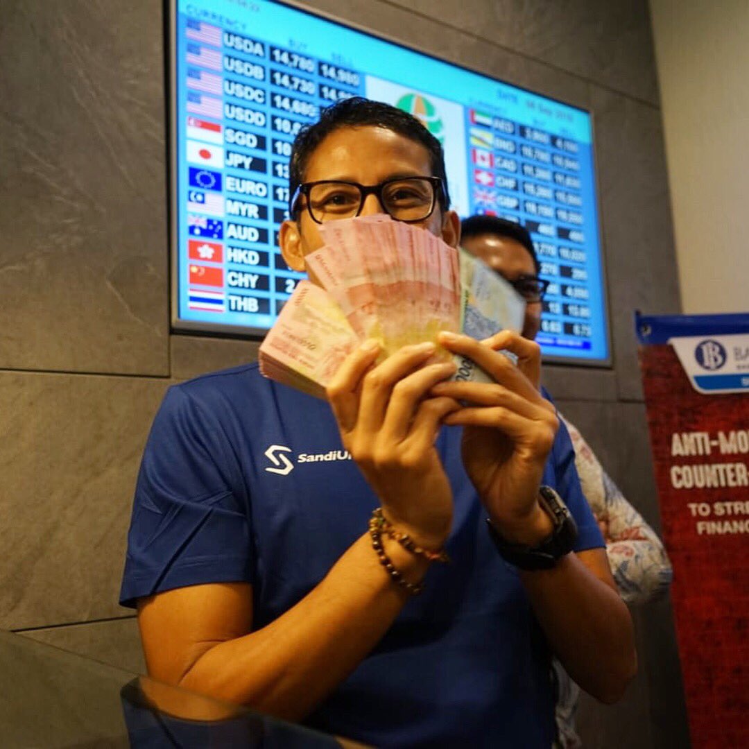 Calon wakil presiden sekaligus pengusaha yang memiliki kekayaan triliunan rupiah Sandiaga Uno menukarkan dollarnya ke kurs rupiah, Kamis (6/9/2018)