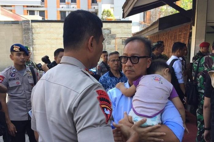 Menteri Sosial, Agus Gumiwang Kartasasmita, sedang menggendong seorang balita korban gempa dan tsunami Palu dan Donggala