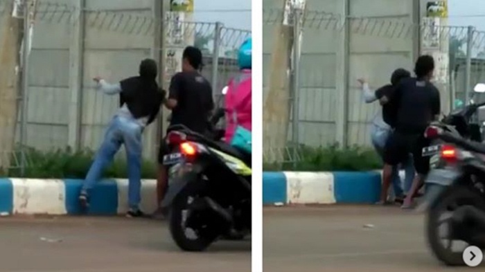 Pria itu bahkan menghempaskan tubuh si wanita ke pagar supaya melepas pegangannya.