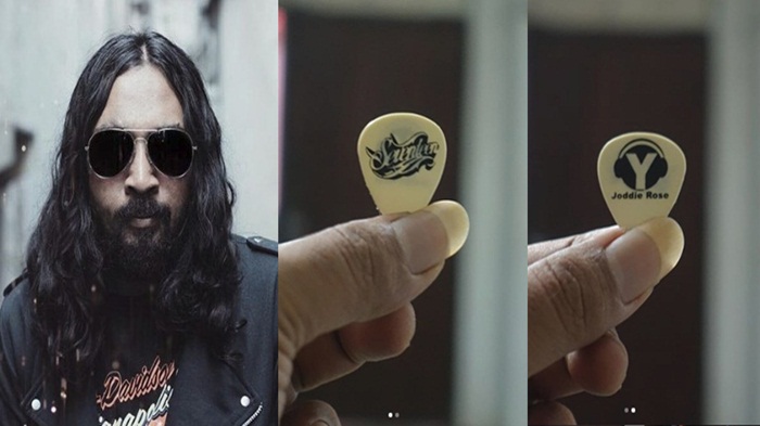 TRIBUNSUMSEL.COM - Mantan gitaris Seventeen, Joddie Rose pakai pick gitar Seventeen saat penggalangan dana tsunami.