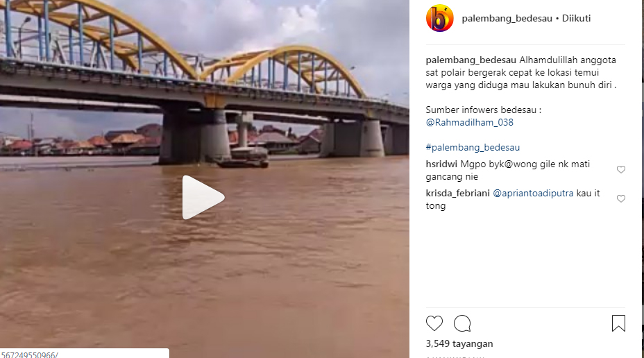 Tapi si pemuda tak meninggal dan berhasil diselamatkan petugas dari Polair Polda Sumsel.