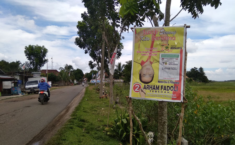 Untuk lebih mengenalkan diri pada masyarakat, caleg bernama Arham Fadoli memajang terbalik fotonya di sebagian baleho yang ia pasang di pinggir jalan.