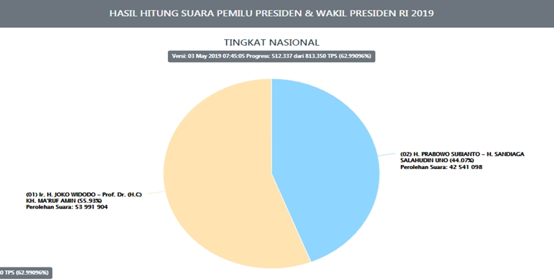 Perlu diketahui, hingga pada Jumat 3 Mei 2019, pukul 03.45 WIB dengan data masuk hingga 62,97% paslon nomor urut 01 Joko Widodo-Maruf Amin mengalami penurunan.