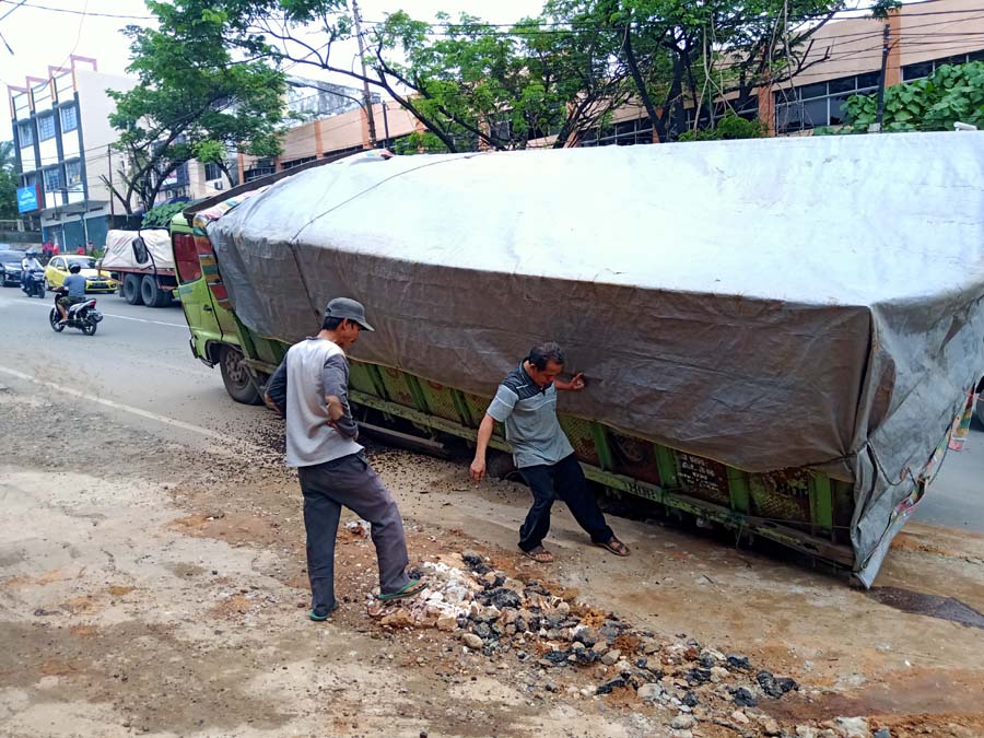 Tiba-tiba truknya langsung ambles dan terperosok di tengah jalan, tepatnya di depan supermarket Giant Kenten.