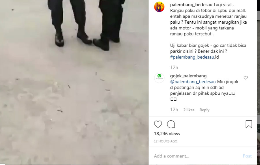 "Terkait video security yg menebar paku d spbu opi jaka baring langsung d dtngi oleh rekan ojol yg ad d jaka baring dan bertemu sama pihak SPBU OPI JAKABARING,silahkan simak penjelasan dr pihak SPBU,yg pasti tujuan nya bukan untk para ojol yg d sano jadi untk maslh nya sdh d selesaikan dgn baik2,terima kasih respon nya buat ojol seputaran jakabaring yg tadi saya hubungi," tulis akun @gojek_palembang.