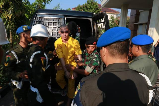 Dia terus berlalu dan digiring ke ruang tahanan Pengadilan Militer I-04 Jakabaring Palembang.