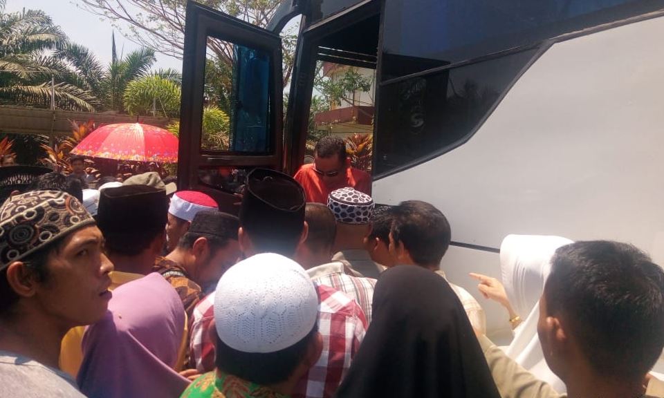 Isak tangis pun pecah saat iring-iringan bus yang membawa jemaah haji memasuki halaman kantor Bupati Muratara.