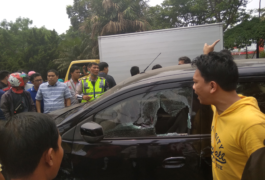 Lemparan dongkrak Fahmi mengenai peneumpang perempuan di mobil cevrolet. Kabarnya di dalam mobil itu juga ada anak kecil.