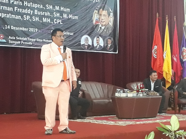 TRIBUNSUMSEL.COM.PALEMBANG - Pengacara kondang, Hotman Paris Hutapea membongkar tips sukses menjadi pengacara kondang sehingga mampu membeli Lambhorghini saat menjadi pembicara seminar hukum nasional 2019 " How To Be An International Lawyer" di Kampus Sthipada Palembang, Sabtu (14/12/2019).