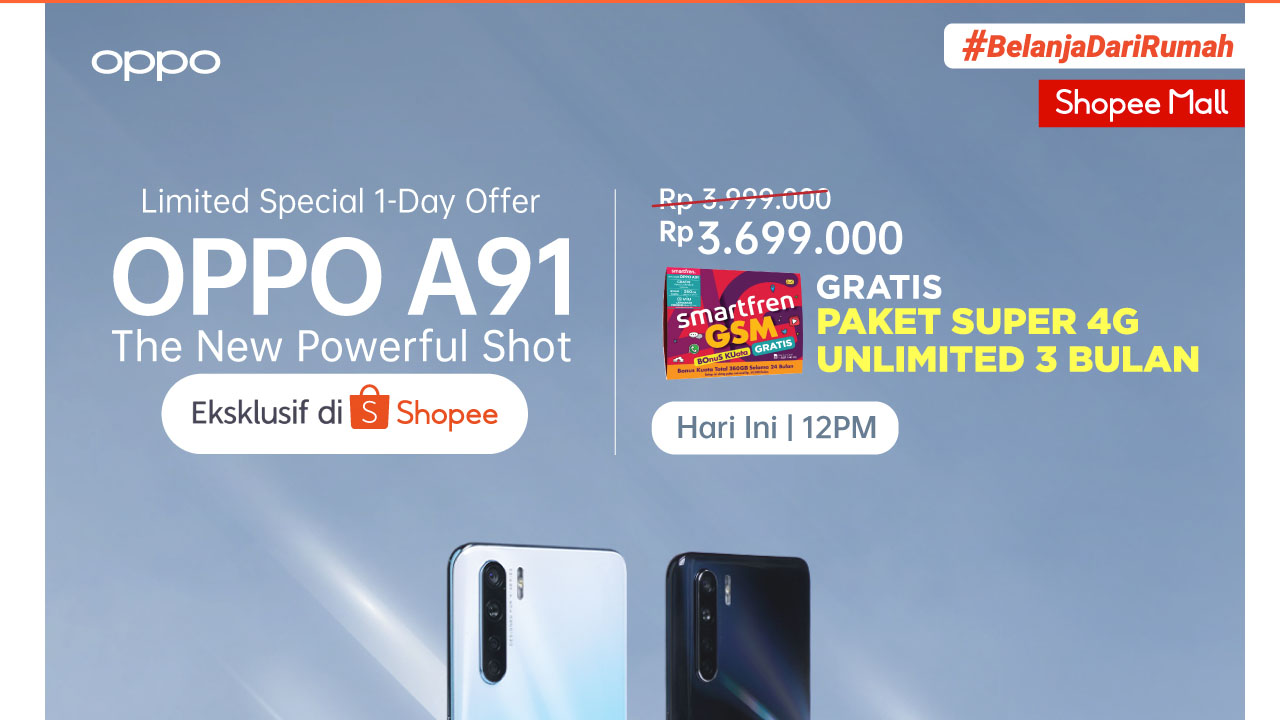 Melansir dari online shop Shopee, HP Oppo A91 dijual secara ekslusif di Shopee dengan harga Rp 3.699.000 ditambah gratis paket internet Smartfren GSM super 4G unlimited 3 Bulan.