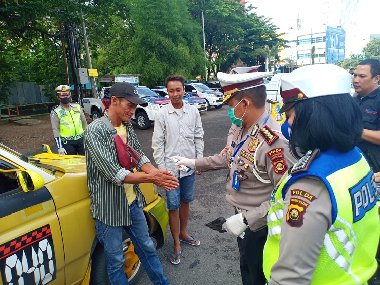 Dirlantas Polda Sumsel Kombes Pol Juni, SH membagikan masker gratis, penyemprotan hand sanitizer dan penyemprotan cairan disinfektan.