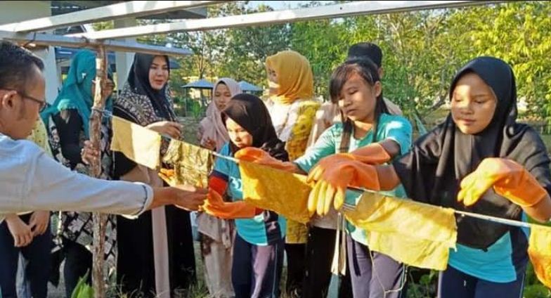Batik jumputan yang diajarkan kepada anak-anak Suku Anak Dalam dibuat menggunakan teknik ecoprint dan dilatih oleh tenaga profesional.