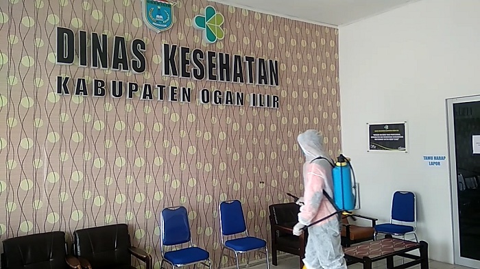 Setelah dua pejabatnya dinyatakan reaktif Covid-19, kantor Dinas Kesehatan (Dinkes) Ogan Ilir Disemprot disinfektan.