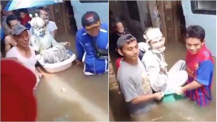 Lalu pada video kedua, warga mengangkat pengantin lelakinya dengan bersusah-payah meski banjir terlihat seukuran betis orang dewasa.