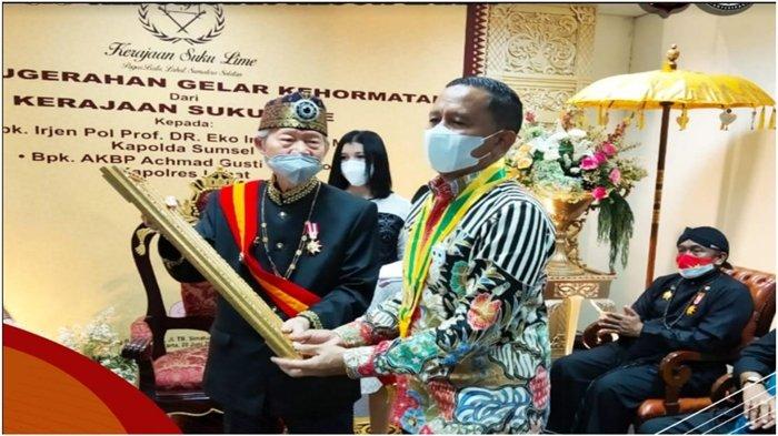 TRIBUNSUMSEL.COM, LAHAT - Dua pejabat polisi jajaran Polda Sumsel yakni Kapolda Sumatera Selatan Irjen Pol Prof Dr Eko Indra Heri S, MM dan Kapolres Lahat AKBP Achmad Gusti Hartono, SIK dianugerahi gelar dari Yang Mulia Ratu Prabu Sira Alam Muda Raja Kerajaan Suku Lime .