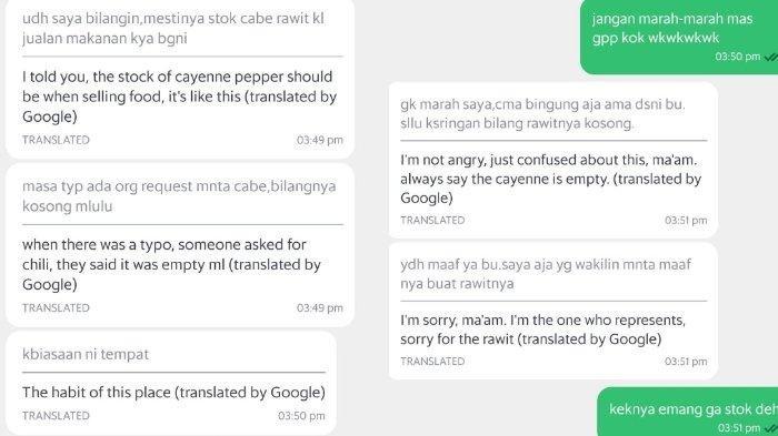 "udah saya bilangin, mestinya stok cabai rawit kalau jualan makanan kayak gini," tulis driver ojol dalam percakapan.