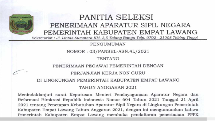 Pemerintah Kabupaten Empat Lawang melalui Panitia Seleksi Penerimaan Aparatur Sipil Negra telah membuka seleksi Calon Pegawai Negeri Sipil (CPNS) dan Pegawai Pemerintah Perjanjian Kerja (PPPK) baik Guru maupun Non Guru berjumlah 87 formasi.
