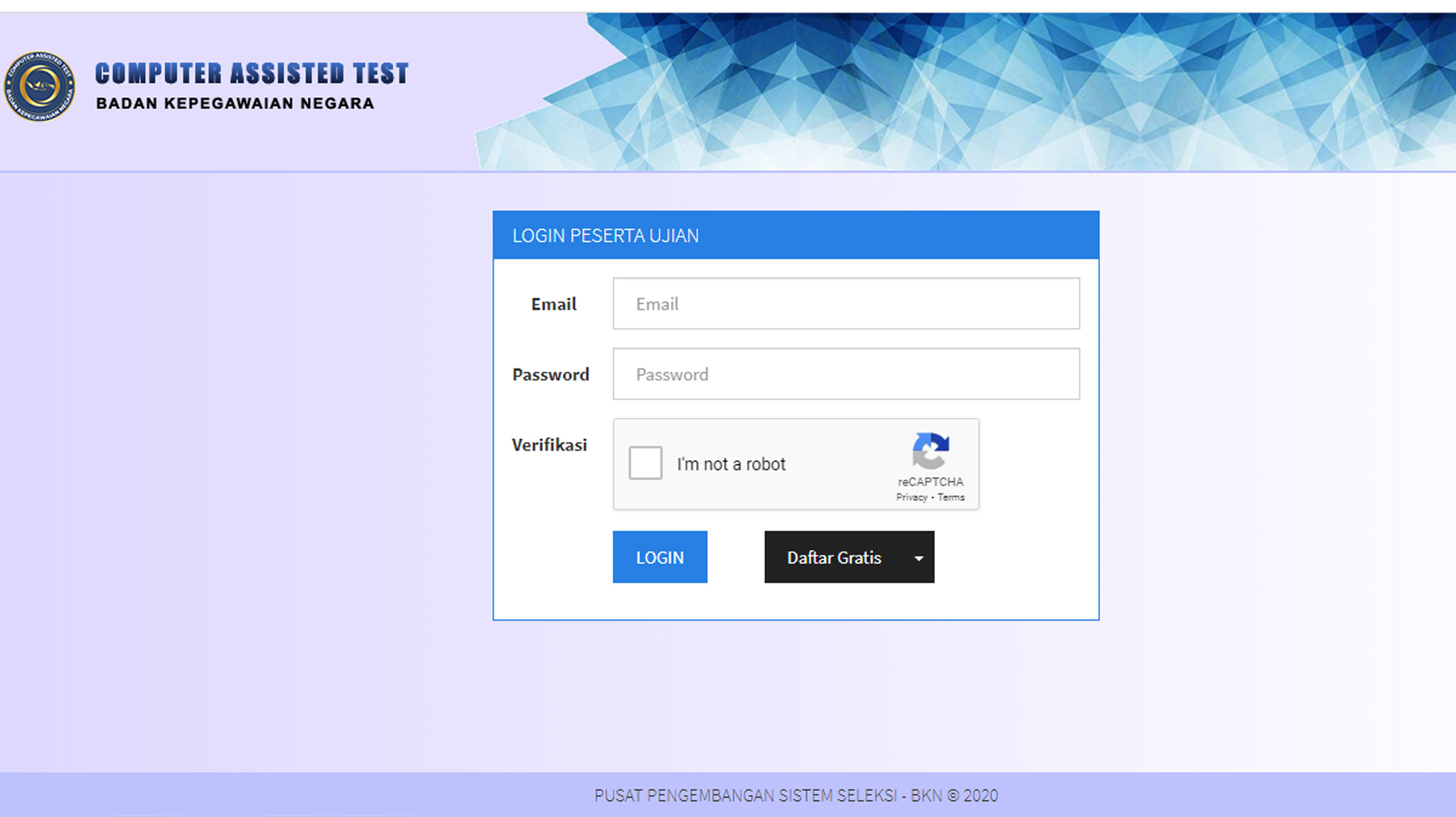 Sebelum mengikuti simulasi ujian berbasis CAT-BKN anda diwajibkan untuk melakukan "Login Peserta Ujian" masukan Email dan Password