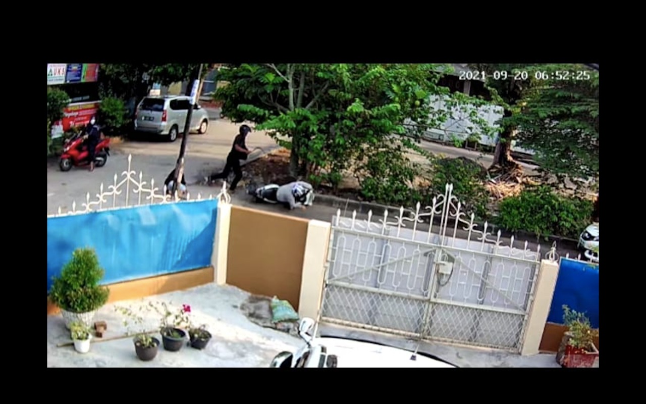 Tiba-tiba pelaku yang berjalan kaki menggunakan helm datang dari arah depan membawa sebuah celurit di tangannya.