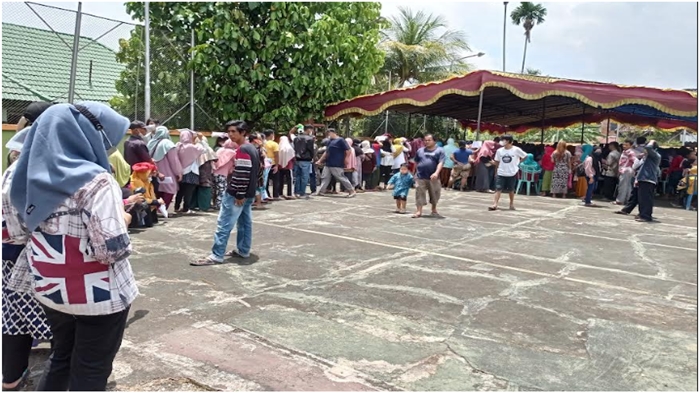 Terlihat ada dua tenda yang disediakan di halaman gedung dan masing-masingnya ramai dipadati warga.