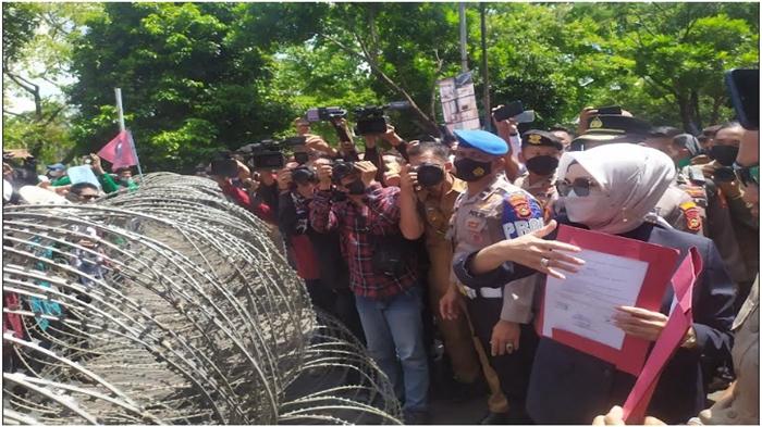 Ketua DPRD Sumsel RA Anita Noeringhati menemui dua aliansi mahasiswa yakni UIN Raden Fatah dan mahasiswa Muhammadiyah yang menggeruduk untuk menyampaikan aspirasi di depan kantor DPRD, Senin (11/4/2022).