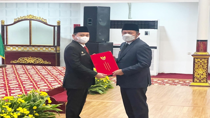 Penyerahan Surat Keputusan (SK) Pengangkatan sebagai Plh Bupati Muara Enim diterima langsung oleh Kurniawan dari Gubernur Sumatera Selatan H Herman Deru di Griya Agung, Kamis (12/5/2022).