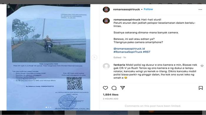 Unggahan akun Instagram @romansasopirtruck yang menjelaskan di wilayah Sukoharjo, Jawa Tengah polisi memasuki persawahan untuk melakukan tilang kepada pengendara motor.