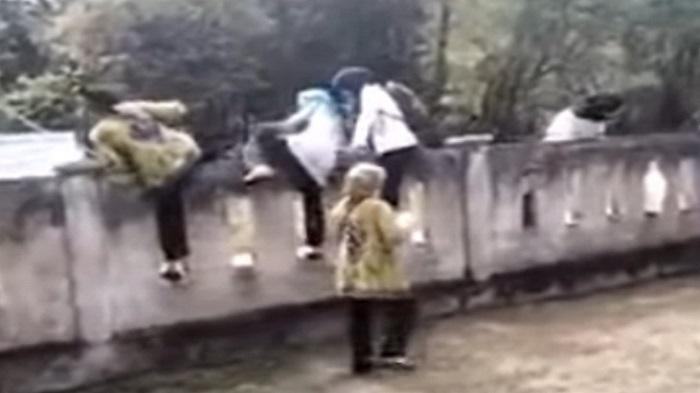 Terlihat dalam video ibu-ibu memanjat tembok sekolah.