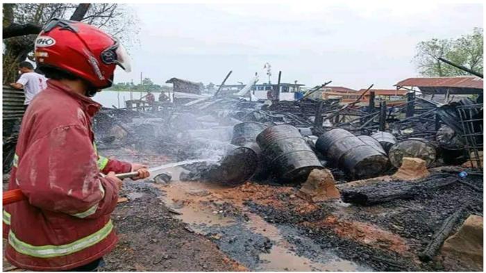 Update kebakaran Gasing Laut Banyuasin, lokasi kebakaran di RT 01 RW 01 Desa Gasing Laut diduga tempat penimbunan BBM ilegal.