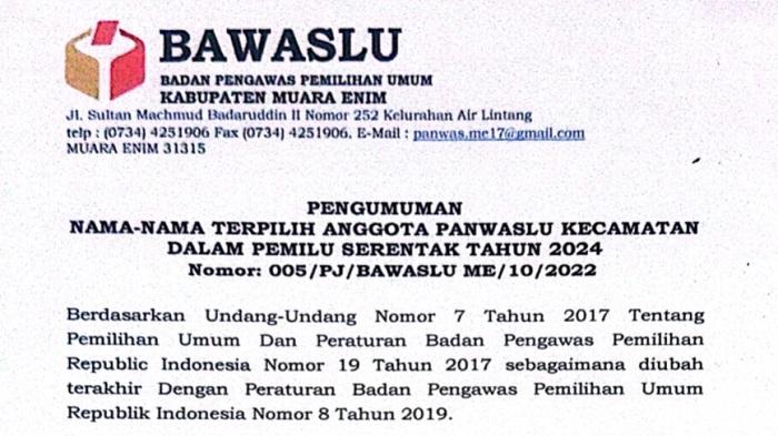 Pengumuman Panwascam Terpilih Muara Enim 2022, Daftar 66 Nama