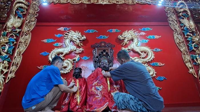 Pantauan Tribunsumsel.com, sejumlah petugas sedang membersihkan altar dewa di dalam Kelenteng Gie Hap Bio dan melakukan penggantian pakaian.
