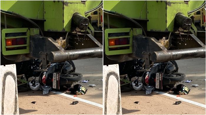 Posisi motor persis berada di bawah bagian belakang truk tangki warna hijau nomor polisi BG 8425 NQ.